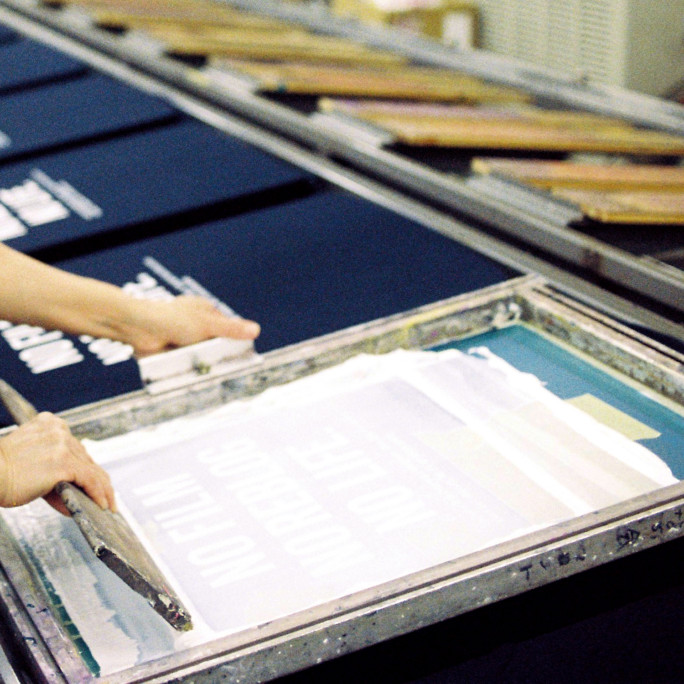 プリントするデザインにあわせた型(版)を作りインクを擦り付ける印刷方法となります。